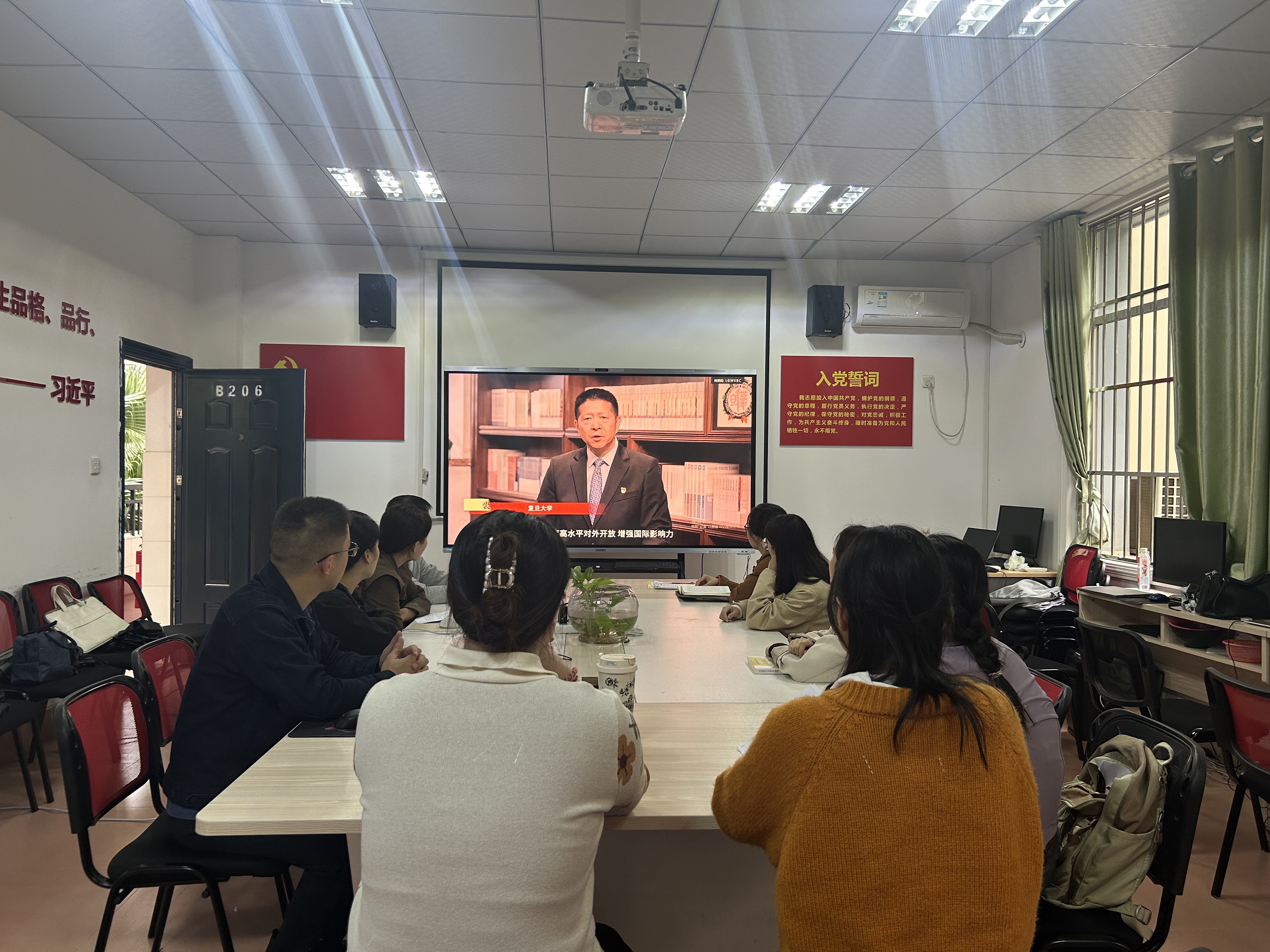 2025年11月7日,2025高校党组织示范微党课第7讲如期开播,本次微党课以《以高水平教育对外开放 答好强国建设时代命题》为主题,由教育部思想政治工作司统筹推进、教育部宣传教育中心具体承办。广西外国语学院马克思主义学院第一党支部迅速响应学习号召,组织部分教师党员在学院党员活动室集中观看,以“沉浸式学习+即时性研讨”的方式,深入领会教育对外开放的时代内涵。