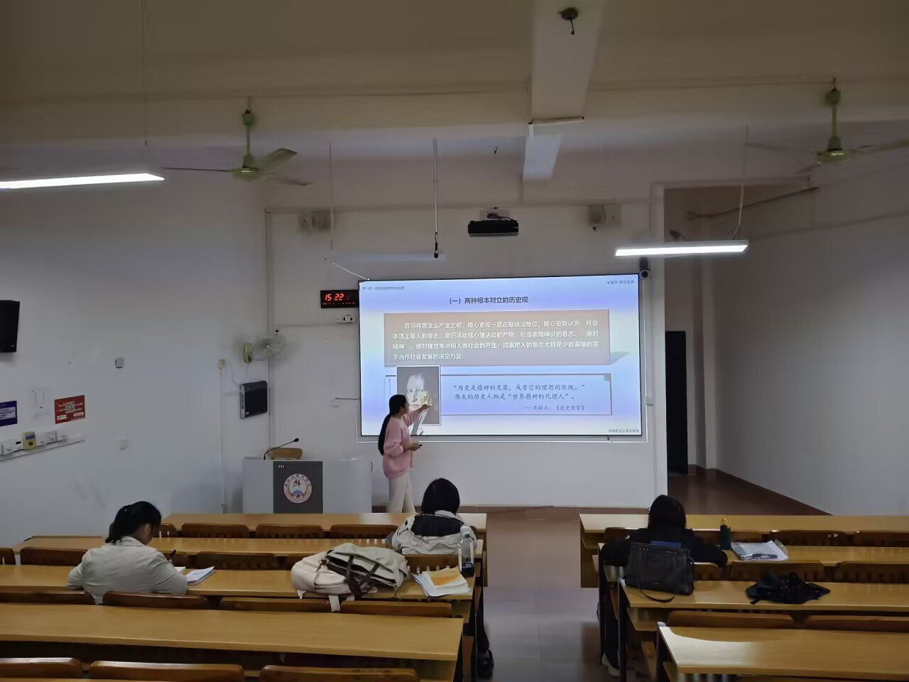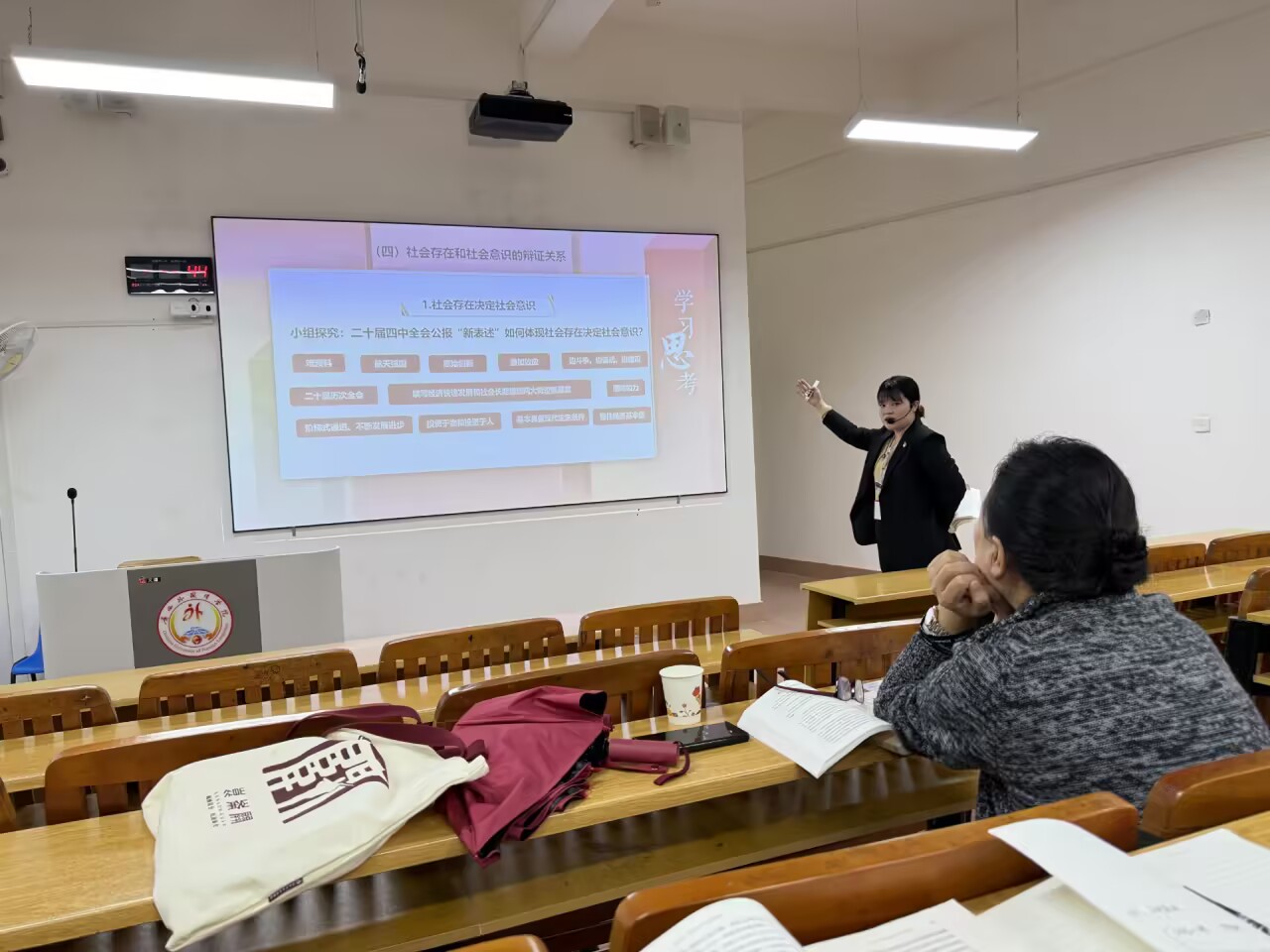 2025年11月4日,为夯实本科教学审核评估基础,推动思政课与时代精神同频共振,马克思主义基本原理教研室(以下简称“马原教研室”)组织开展“人人过关”教学活动。马原教研室青年教师与对应督导老师分组参与,以《马克思主义基本原理》第三章第一节“人类社会的存在与发展”为核心试讲内容,将党的二十届四中全会精神深度融入课堂教学,形成“理论原理—时政表述—现实存在”的三维教学链条,打造理论与实践结合的思政金课。通过“现场授课展示+精准点评指导”的模式,帮助教师强化教学基本功与思政育人能力,全力保障每位青年思政课教师在评估期间展现最佳教学状态。
