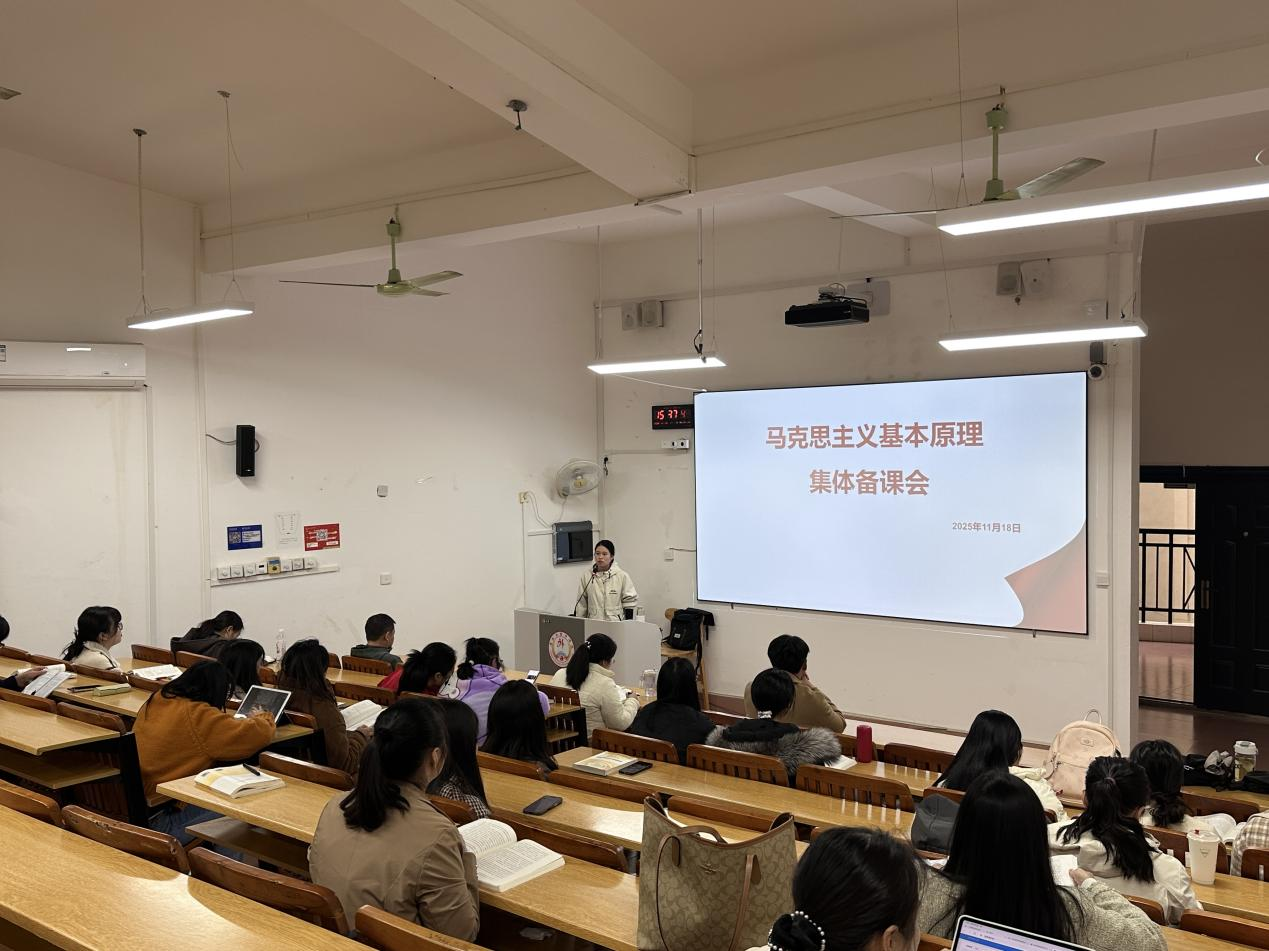 在学校本科教育教学审核评估关键阶段,为紧扣“以评促建、以评促改、以评促管、以评促强”的方针要求,为持续提升思想政治理论课教学质量与育人实效,精准把握“马克思主义基本原理”课程第四章“资本主义的本质及规律”内容的教学重点与难点,2025年11月18日下午,马克思主义学院马克思主义基本原理教研室(以下简称“马原教研室”)在知新楼A108教室组织开展集体备课活动,教研室全体教师参加此次集体备课活动。