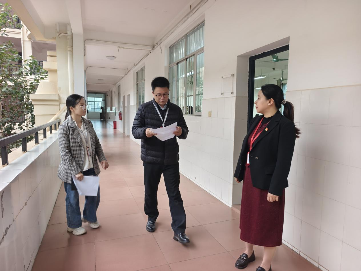 云芸院长(右一)、苏俊吕执行院长(右二)、周献策副院长(左一)正在共同开展课堂巡查工作